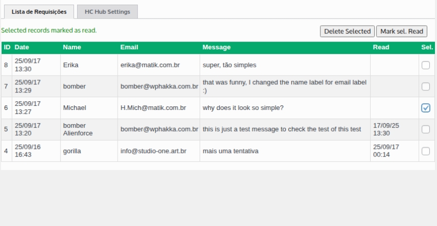 below you see the contact list, in cronological order, newest first, for any purpose you might want to hold the list items for some time, just mark them read soon you answered one, or delete as well